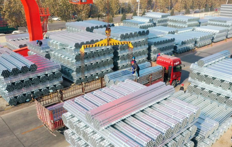 12月5日,成安县一家制管企业的工作人员将产品装车外运(无人机照片)。近年来,河北省邯郸市成安县大力推进金属制管产业集群式发展,不断提升企业生产效率和市场竞争力,做大做强产业规模,打造千万吨级钢管制造基地,助力县域经济高质量发展。