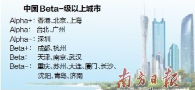 相比2016年,广州排名再次上升,位列第27位,在该名册中首次进入Alpha级别。位于该级别的中国城市还有台北。值得关注的是,深圳在2018年的名册中,首次进入Alpha-级别,与2016年相比,直接上升了两个级别。