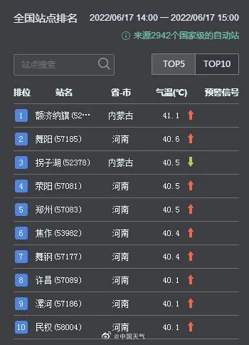 据@中国天气,今天又是40℃才能入气温榜的一天。内蒙古以高温强度占据榜一,河南以登榜8席的数量取胜 。不仅白天热,晚上也热哭你!像郑州,35℃以上的高温状态从6月16日12点一直持续到了夜里23点…
