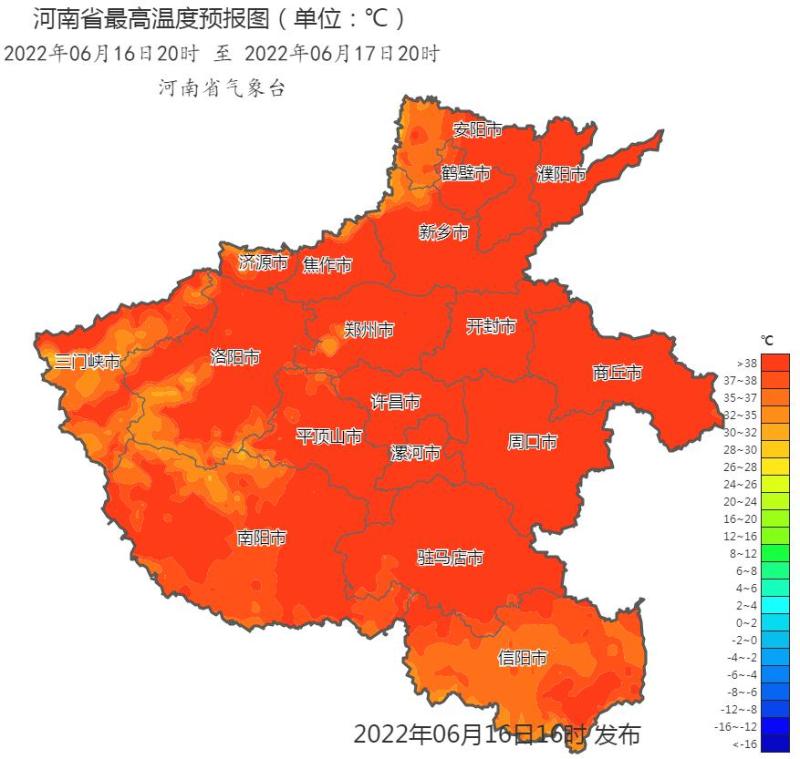 16日,全省大部地区最高气温在37℃以上,多地气温超过40℃。预计22日前,全省大部最高气温在37℃以上,北中部部分县市可达40到42℃。