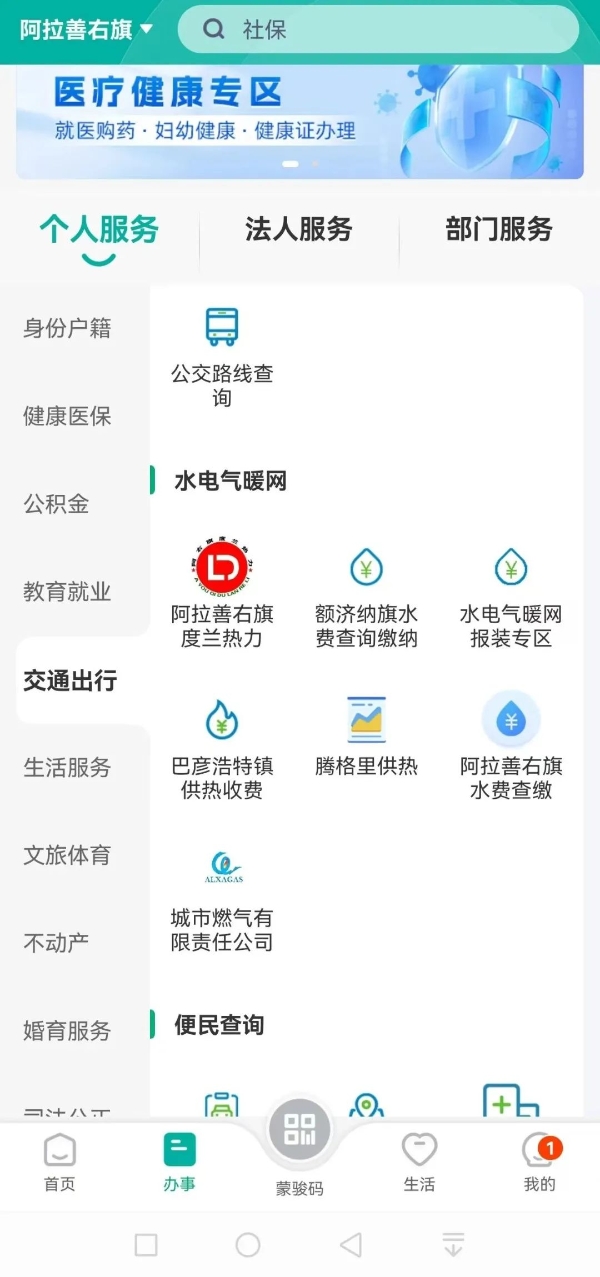 下载并打开蒙速办APP→进入办事页面→点击“生活服务”阿拉善右旗度兰热力