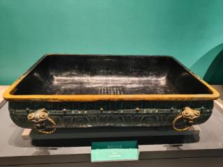 那么,何为盘呢?青铜器博物院工作人员郑苗解释道,青铜盘是青铜器中的盛水礼器,乍一看像现代人用的平底锅,一般为圆形,因为要用来接水,所以体形比较大,盘体通常有附耳、圈足,盘身则有纹饰、兽首装饰等。青铜盘常与青铜盉(hé )或青铜匜(yí )搭配使用,使用场景为盥洗礼。在《礼记》中有记载:“进盥,少者奉盘,长者奉水,请沃盥,盥卒授巾。”意思是说在行沃盥之礼时,年轻的仆人端着接水的盘,年长的仆人捧着装水的器皿,请贵族洗手,洗完后递上手巾。一般在祭祀和用膳时,都要行沃盥之礼。《左传》中“奉匜沃盥”的记载,描写的也是这一礼仪。盘与盉或匜配合使用,是西周贵族们行“沃盥之礼”的重要器皿。