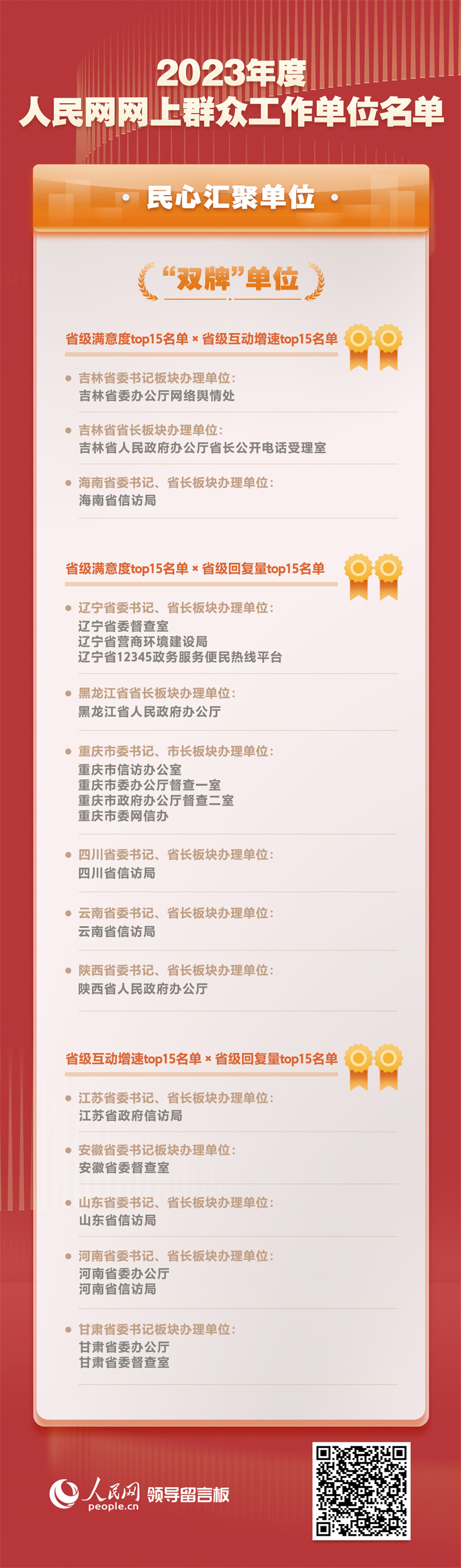 此次公布的名单综合全国各地区各部门各单位近一年来的满意度、互动增速、回复量等指数,着重突出各地区各部门各单位依托人民网“领导留言板”开展网上群众工作情况,选出2023年度人民网网上群众工作“民心汇聚单位”“实干担当单位”“汇智为民单位”和“活力奋进单位”,共600余家。