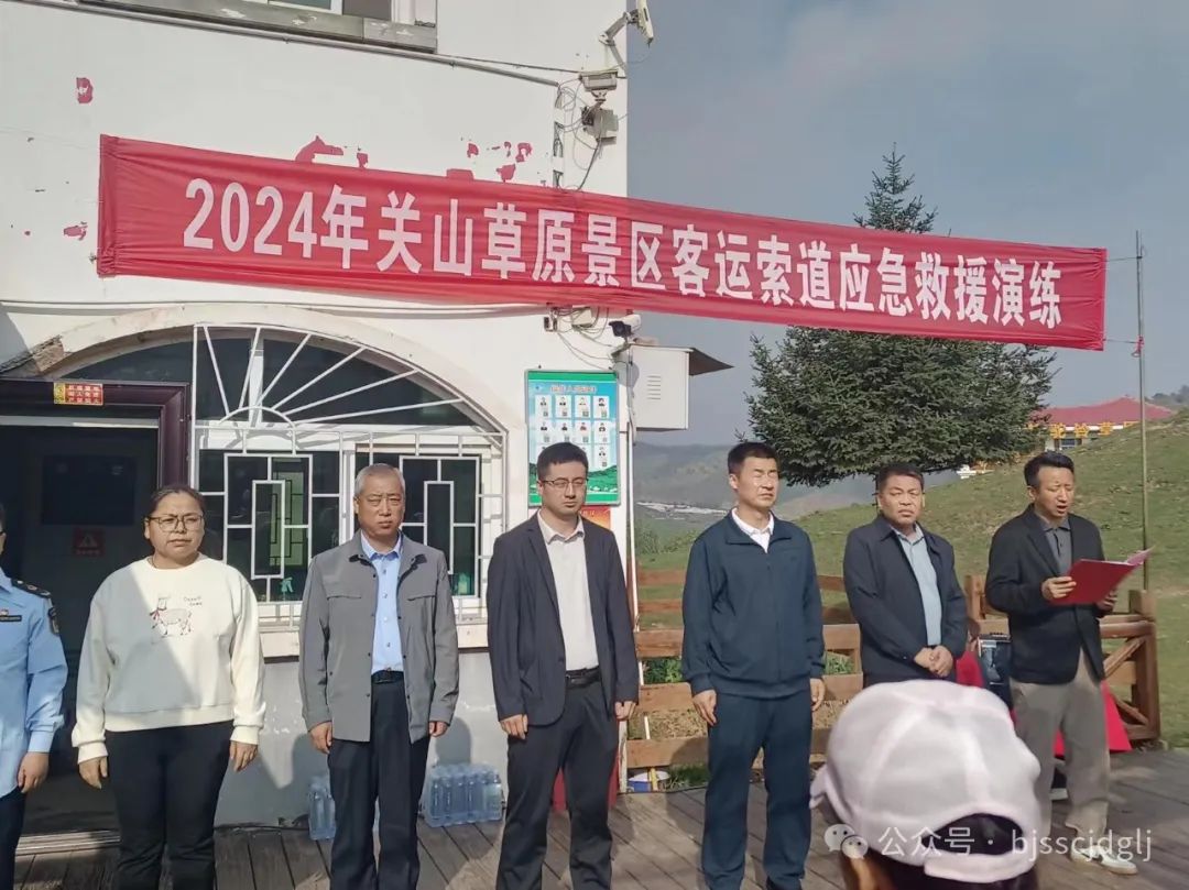 为进一步提升景区客运索道突发事件应急处置能力,确保游客安全,2024年9月27日,陇县市场监管局联合关山旅游公司开展景区客运索道安全应急救援演练,为国庆假期安全保驾护航。副县长田亮,市场监管局领导及相关股室成员,关山草原工作人员共40余人参加了演练活动。