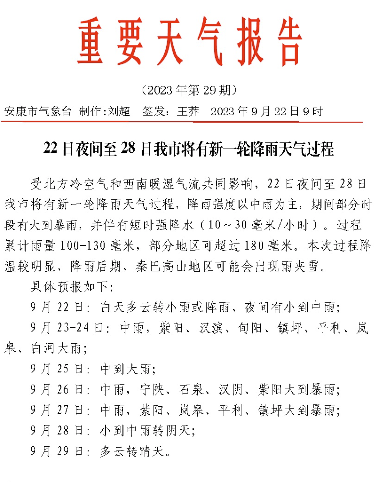 23日:全省阴天。陕北北部部分地方有小雨或阵雨;陕北南部、关中大部、陕南西部有小雨,局地有中雨;陕南东部有小到中雨。 陕北大部有4-5级偏南风,关中北部有3-4级偏东风,阵风可达6级以上。日平均气温陕北大部、关中东部下降4℃左右。