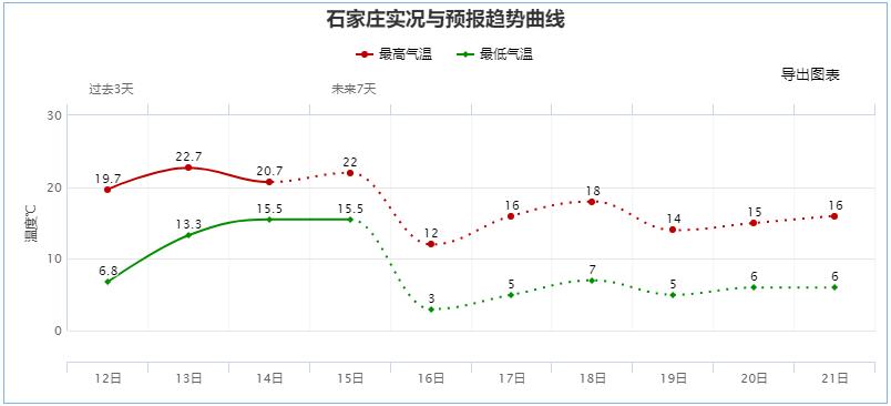 石家庄市气象台2021年10月15日11时04分发布寒潮蓝色预警信号:受冷空气影响,预计今天夜间到17日,石家庄(市主城 区,鹿泉区,井陉县,井陉矿区,正定县,栾城区,行唐县,灵寿县,高邑县,深 泽县,赞皇县,无极县,平山县,元氏县,赵县,辛集市,藁城区,晋州市,新乐 市)最低气温下降10-12℃,局地 12℃以上,17 日早晨最低气温将降至 1-3℃,北部和南部低洼地带将降至 0-1℃。请有关单位和人员做 好防范准备。