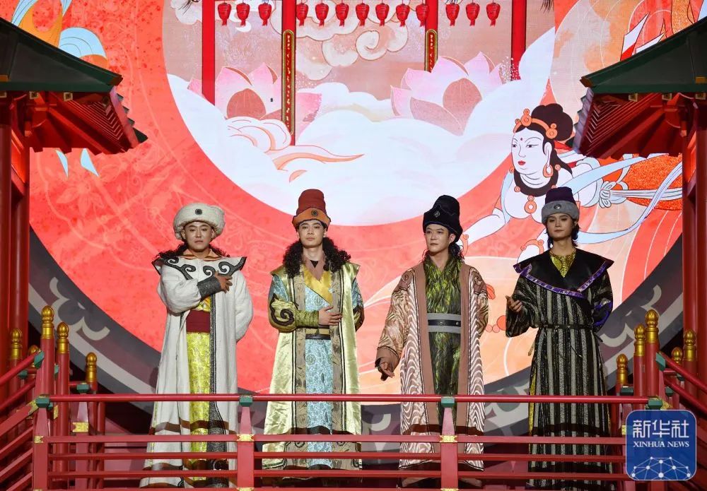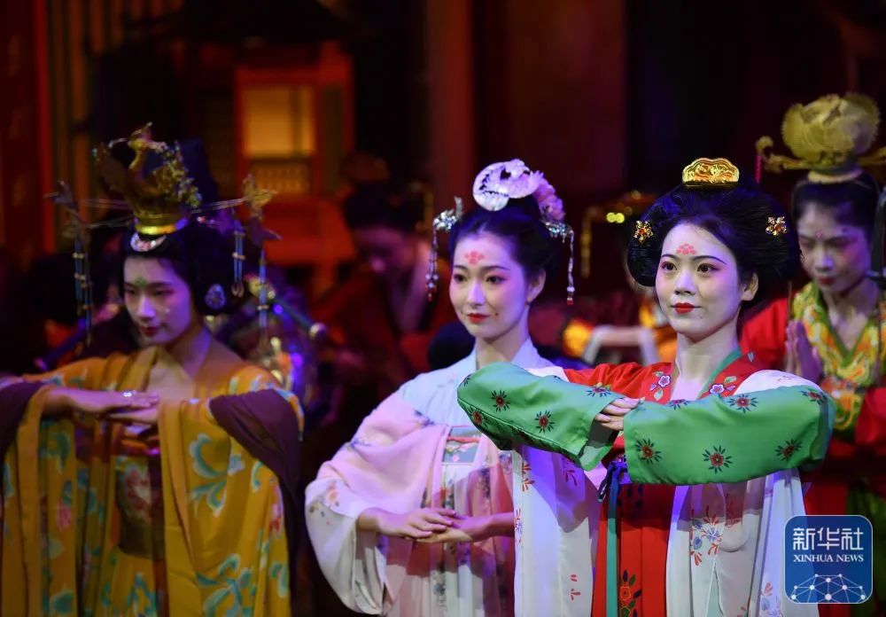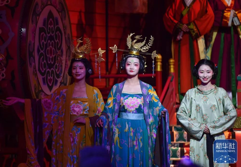 当日,由甘肃敦煌研究院莫高学堂与陕西西安长安十二时辰主题街区联合打造的服装秀在西安上演。表演展示的服装以敦煌壁画为设计主题,吸引市民游客前来观赏。新华社记者 张博文 摄影报道