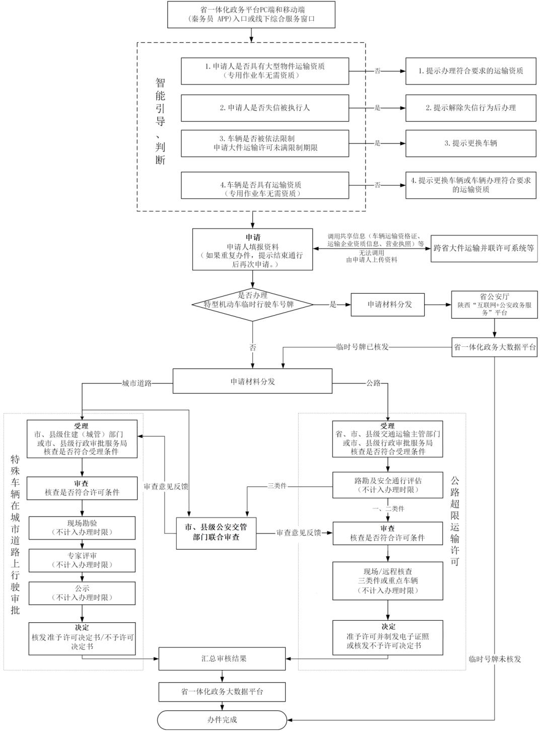 协同相关部门优化整合申请材料,建立线上并联审批工作机制,形成大件运输“一件事”规范化、电子化审批模式和办事指南。组织建设线上统一受理端,升级改造陕西省公路路产保护信息系统、陕西省大件运输车辆审批管理子系统(以下简称大件审批系统)等,做好相关技术支持工作。负责“跨省、自治区、直辖市进行公路超限运输许可”、“在省、自治区范围内跨设区的市或者在直辖市范围内跨区、县进行公路超限运输许可”事项审批;负责“在设区的市范围内跨区、县进行公路超限运输许可”、“在区、县范围内进行公路超限运输许可”事项梳理和业务指导,强化跨层级跨部门业务协同和数据共享,汇聚全省《超限运输车辆通行证》证照信息至省电子证照管理系统。