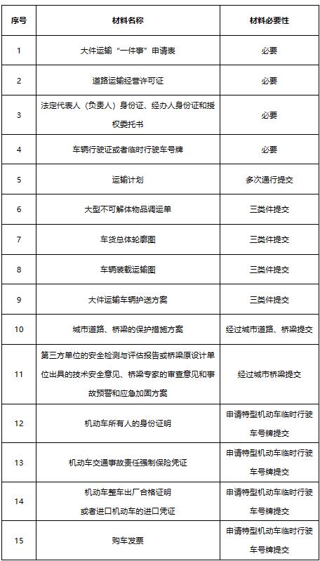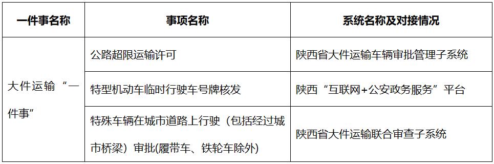 (一)实现大件运输“一次办成”。将“公路超限运输许可”、“特型机动车临时行驶车号牌核发”、“特殊车辆在城市道路上行驶(包括经过城市桥梁)审批(履带车、铁轮车除外)”整合为大件运输“一件事”,整体压缩办理时间和跑动次数,推动业务系统对接和数据共享,实现网上办、一次办,更好满足企业和群众办事需求。