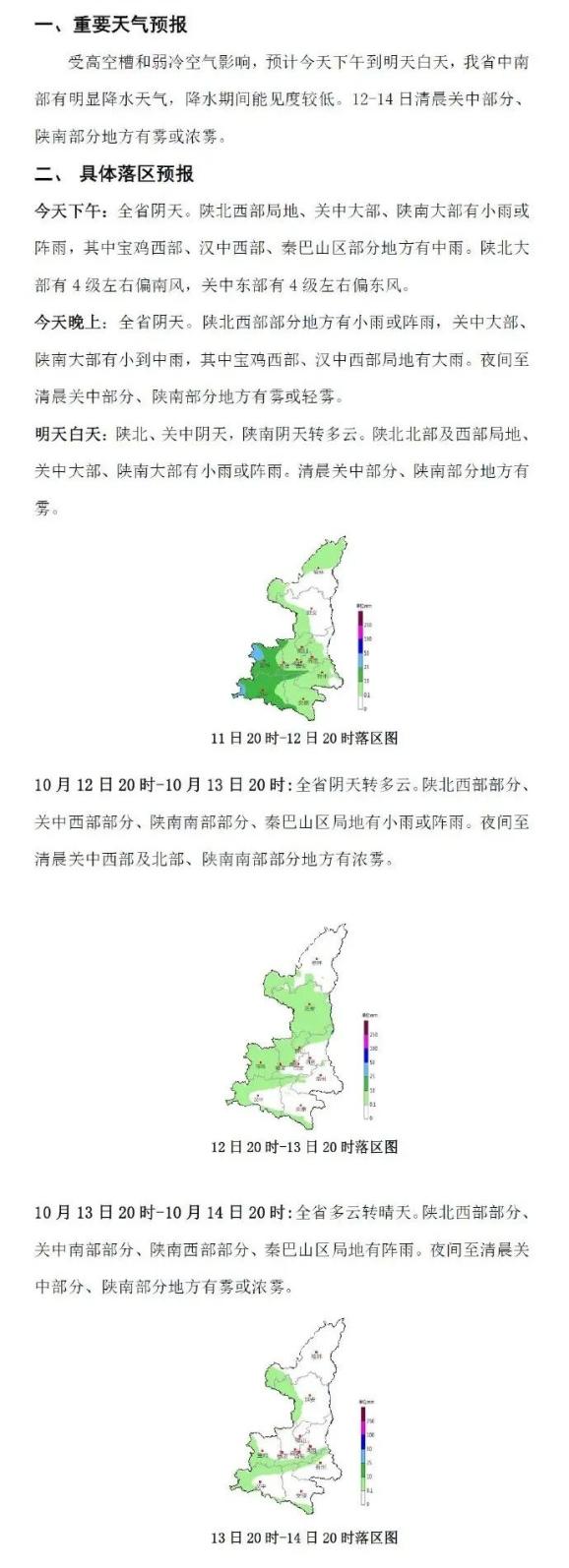 受高空槽和弱冷空气影响,预计今天下午到明天白天,我省中南部有明显降水天气,降水期间能见度较低。12-14日清晨关中部分、陕南部分地方有雾或浓雾。