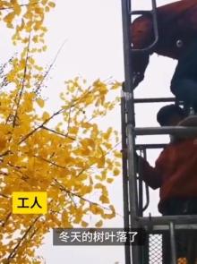 ▲10月27日,郑州高新区一商场将路边栽种的8棵银杏树绑上假树叶。这些假树叶颜色金灿,工人称装上后更美观。环卫工人表示,银杏叶还没落完,他们就把真树叶撸掉后装上假树叶。