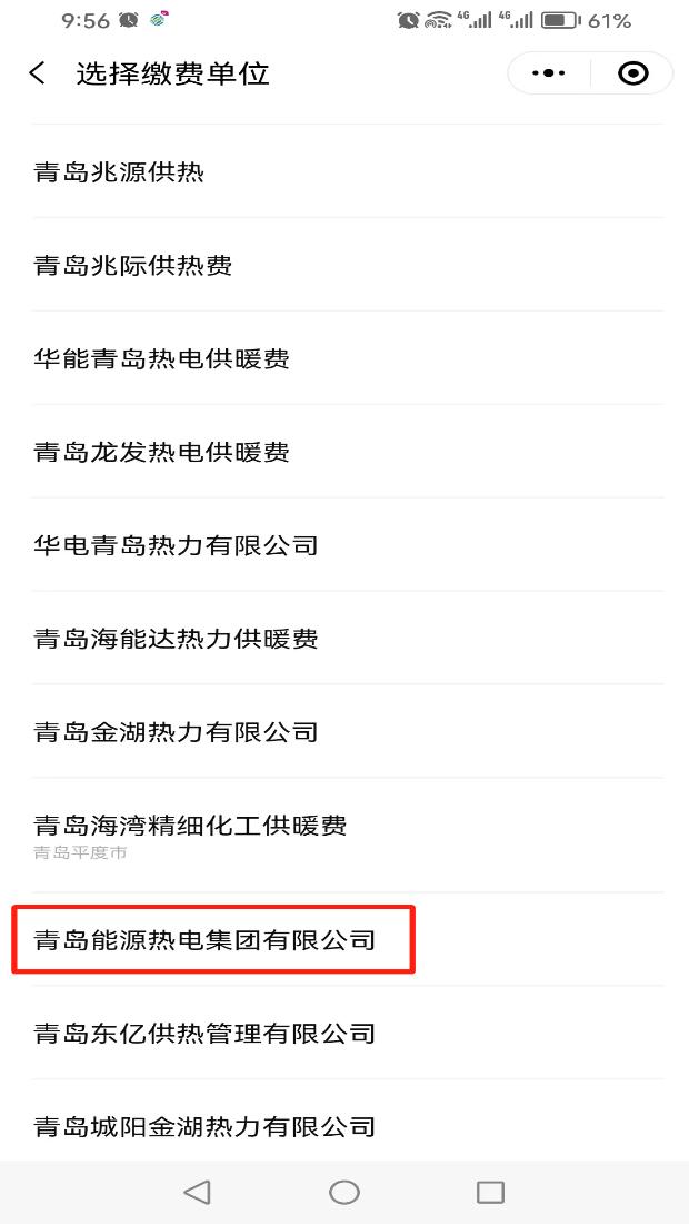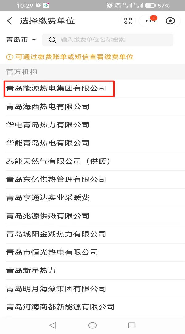 “青岛能源热电集团有限公司”缴费范围包括:青岛能源热电集团有限公司(第一热力有限公司、第二热力有限公司、第三热力有限公司、第四热力有限公司、第五热力有限公司、第六热力有限公司、青岛金泉热力有限公司、青岛金源热电有限公司、青岛金海热电有限公司、青岛恒源热电有限公司、高新热电公司、滨河新城公司)、青岛能源发展(莱西)有限公司(青岛金莱热电有限公司、青岛金涌热电有限公司)、青岛能源发展(胶州)有限公司(青岛开源胶州热电有限公司、青岛金洲热力有限公司)。
