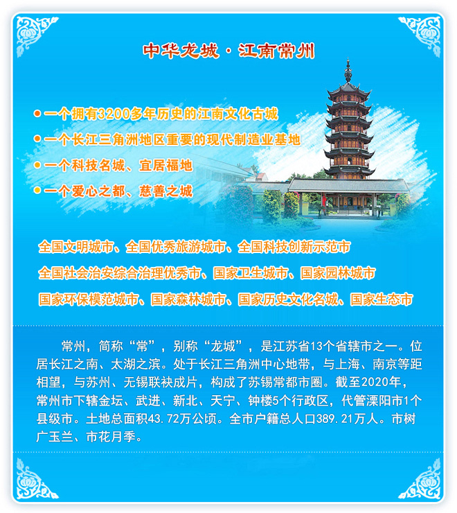 常州位于北纬31°09′至32°04′、东经119°08′至120°12′,地处江苏省南部、长三角腹地,东与无锡相邻,西与南京、镇江接壤,南与无锡、安徽宣城交界,与上海、南京两大都市等距相望,区位条件优越。常州是一座有着3200多年历史的文化古城。春秋末期(前547年),吴王寿梦第四子季札封邑延陵,开始了长达2500多年有准确纪年和确切地名的历史。西汉高祖五年(前202年)改称毗陵。西晋武帝太康二年(281年),改置毗陵郡。自此,常州历朝均为郡、州、路、府治所,曾有过延陵、毗陵、毗坛、晋陵、长春、尝州、武进等名称,隋文帝开皇九年(589年)始有常州之称。于1949年设市。截至2020年,常州市下辖金坛、武进、新北、天宁、钟楼 5 个行政区,代管溧阳市 1 个县级市,全市共有 33 个 镇、29 个 街 道。土地总 面 积 43.72 万 公 顷,其 中 陆 地 面 积 33.1 万公顷、水域面积 10.62 万公顷,耕地面积 15.25 万公顷。2022年年末全市常住人口536.62万人,增长0.31%。全年出生人口2.96万人,死亡人口3.21万人,人口自然增长率为-0.47‰,比上年下降0.38个千分点。年末城镇常住人口418.64万人,比上年增加3.62万人。城镇化率为78.01%,比上年提升0.43个百分点。全市户籍总人口389.21万人,增长0.27%。