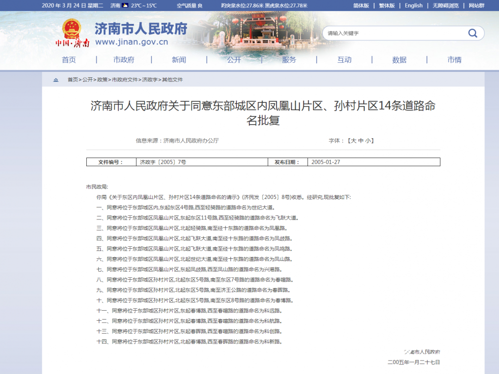 记者拨打了济南市民政局工作人员的电话,工作人员告诉记者:关于“凤歧路”的名字问题,2005年的时候,政府批复了济政字〔2005〕7号文件《济南市人民政府关于同意东部城区内凤凰山片区、孙村片区14条道路命名批复》,将其命名为“凤歧路”,应该为“止”字旁的“歧”。