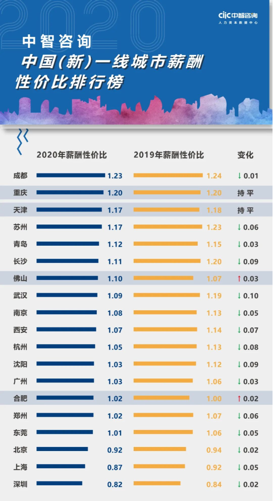 近期,中智咨询数据中心发布了《2020年中国(新)一线城市薪酬性价比榜单》,这是继2017年和2019年发布后的第三届评比榜单。