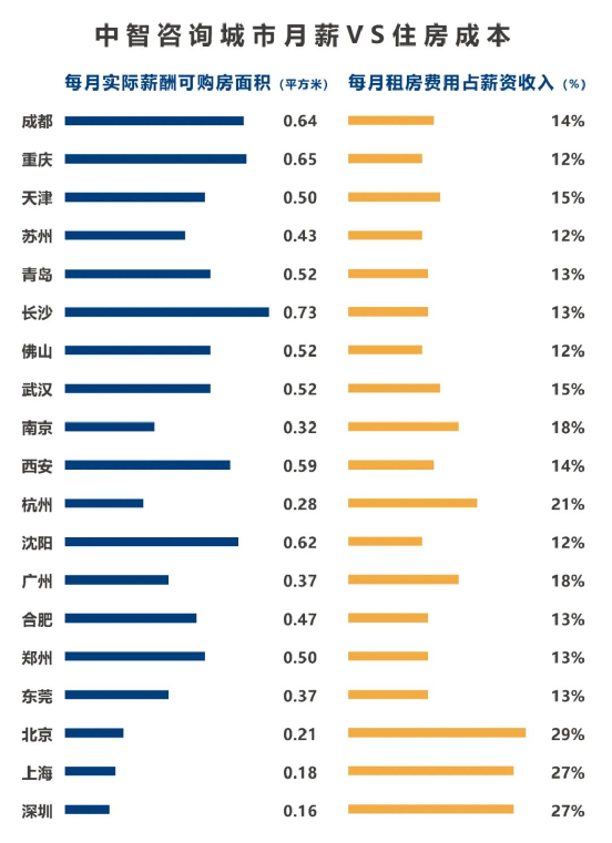 以本届榜单中薪酬性价比最高和最低的城市--成都和深圳为例,成都的薪酬性价比为1.23,深圳为0.82。这意味着: