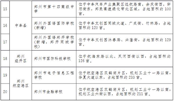 郑州市人民政府发布了《郑州市市属高中阶段学校建设三年行动计划(2020—2022年)》,至2022年计划建设20所高中阶段学校,其中普通高中16所(迁建高中1所、分级管理分离高中9所、新增优质高中6所),中等职业学校4所。