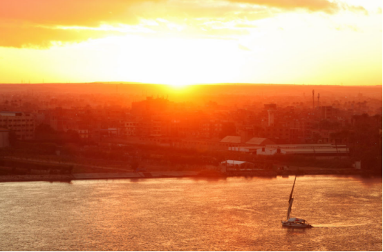 一艘帆船行驶在埃及开罗被霞光映红的尼罗河上。