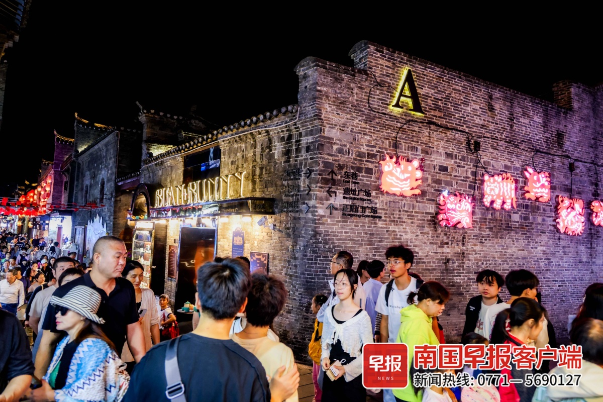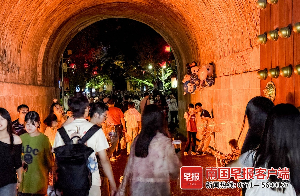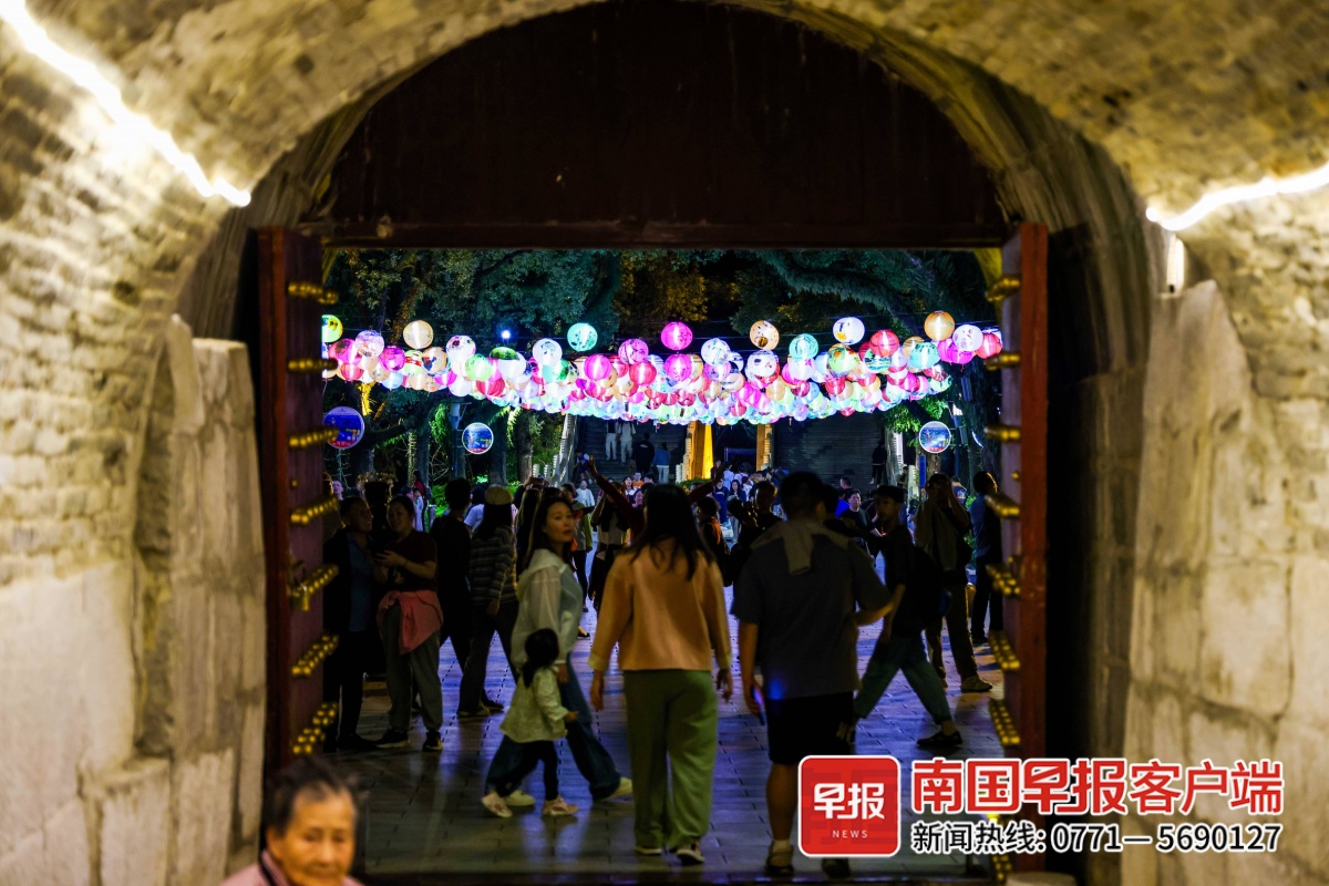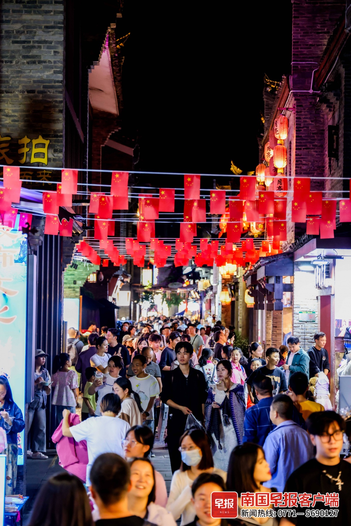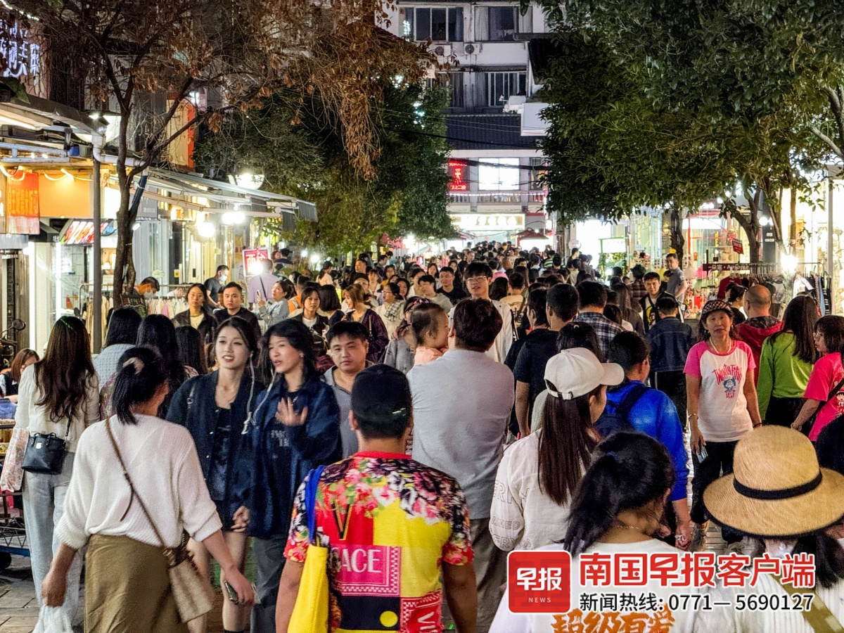 国庆假期,桂林这座世界知名的旅游城市成为众多游客的旅游目的地。10月4日晚,古南门的大榕树和灯笼、正阳步行街的美食、王城古城墙的沧桑以及东西巷的特色建筑等,吸引了无数游客争相前来打卡,呈现出“人从众”的热闹场景。