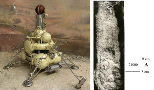 维基;(右)月球16号采回的一管钻取样品,编号21000 |