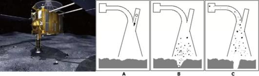 一旦探测器检测到底部长长的采样杆接触到了小行星表面,就即刻从采样杆中以300米/秒的速度发射出一枚钽质子弹,子弹撞出的碎屑被弹射入采样杆中,经过多次反射探测器所收集。