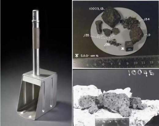 阿姆斯特朗完成第二次采样所用的铲子和采回的样品示例 |