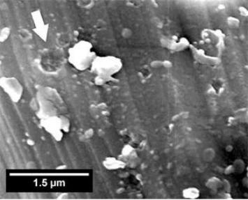 星尘号收集样品的气凝胶切片中采集到的彗星尘埃(箭头处)| NASA