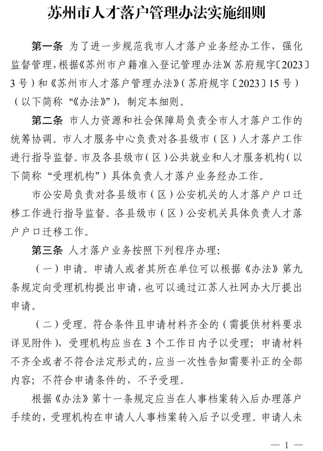 为做好《市政府关于印发苏州市人才落户管理办法的通知》(苏府规字〔2023〕15号)(以下简称“《办法》”)的政策实施,11月30日,苏州市人力资源和社会保障局、苏州市公安局配套印发了《苏州市人才落户管理办法实施细则》(苏人保规〔2023〕1号)(以下简称“《细则》”)。