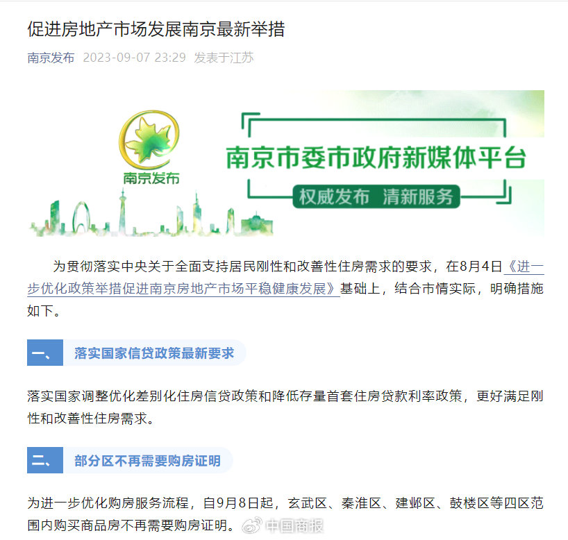 9月7日,南京发布促进房地产市场发展最新举措。其中提出,为进一步优化购房服务流程,自9月8日起,玄武区、秦淮区、建邺区、鼓楼区等四区范围内购买商品房不再需要购房证明。值得一提的是,上述四区此前是南京仅剩的限购区域。在这四个区域不再限购后,意味着南京已全面取消商品房限购。