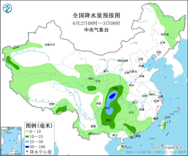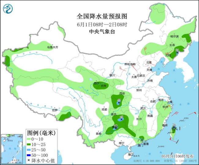 图1 全国降水量预报图(5月31日08时-6月1日08时)