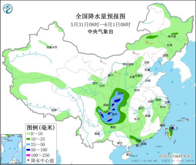 5月31日08时至6月1日08时,西北地区东部、西南地区东部等地部分地区有中到大雨,陕西南部、四川盆地东部和南部、贵州西北部、台湾岛东北部等地部分地区有暴雨,其中,四川盆地、台湾岛东北部局地有大暴雨(100~120毫米)。内蒙古、东北地区南部、浙江、福建沿海、台湾岛等地部分地区有4~6级风(见图1)。台湾以东洋面将有9~11级风,阵风12级,东海南部海域、台湾海峡、巴士海峡将有7~9级风,阵风10级左右。