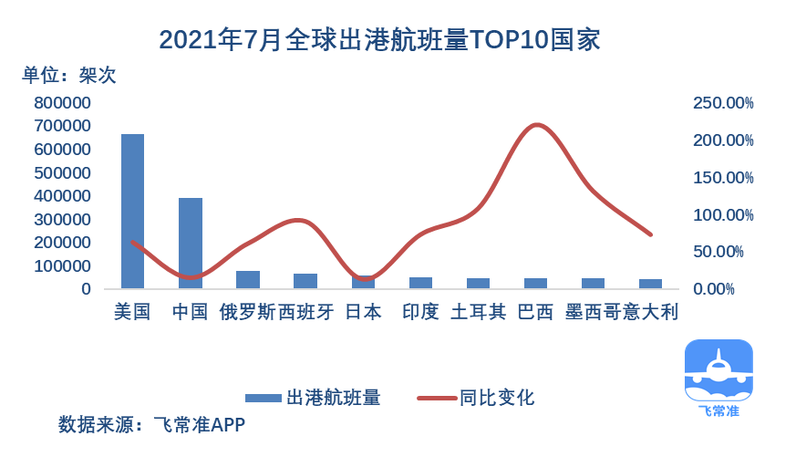 7月全球实际出港航班量TOP10国家依次为美国、中国、俄罗斯、西班牙、日本、印度、土耳其、巴西、墨西哥和意大利。同比去年,本期(2021.07.01-2021.07.31)各国航班量延续正增长态势,其中巴西同比恢复最多。