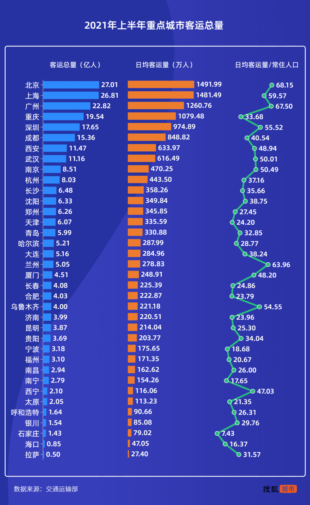 从客运量来看,今年上半年,北京、上海、广州三大一线城市的客运总量均超过20亿,稳居第一梯队。重庆、深圳西安等城市客运总量超过10亿,位居第二梯队。