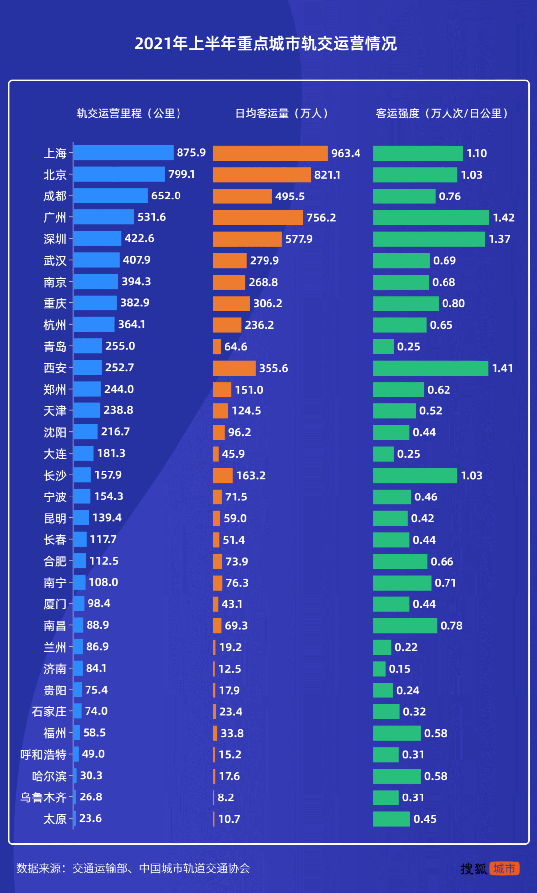 尽管西安的运营里程总长度排名在十名之后,但日均客运量却达到355.6万人,位居全国第六,这也就导致西安的轨交客运强度以1.41万人次每日每公里位居全国第二,而“全国第一挤”城市广州的客运强度为1.42万人次每日每公里。