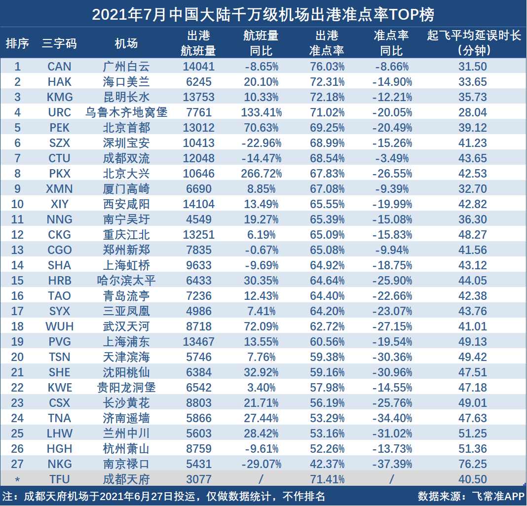 中国大陆千万级机场7月航班准点率排名中,广州白云机场以76.03%的出港准点率排在首位,海口美兰机场、昆明长水机场分列2、3位。