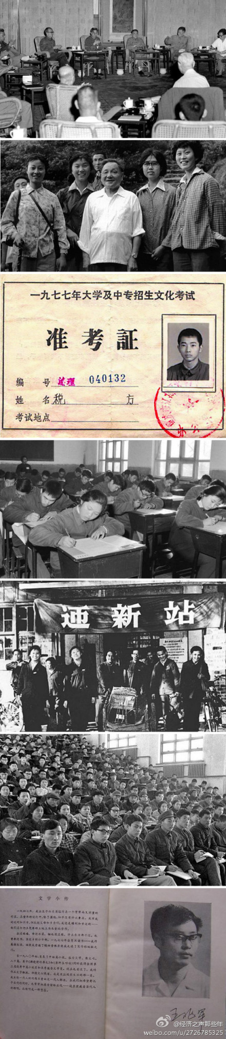 主持人:1977年,张艺谋在得知恢复高考这个消息的时候,他还是咸阳棉纺织厂的一名搬运工;中国人民大学教授张鸣,1977年正在黑龙江一个农场的猪圈里干活;中国著名企业家、原中国房地产开发集团总裁孟晓苏,当时还是北京汽车制造厂的一名普通电工;国家总理李克强当年是安徽省凤阳县大庙公社大庙大队党支部书记,通过这次高考,考进了北京大学法律系。