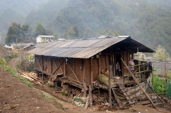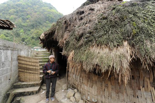 他和母亲住的茅草房已有几十年历史,是用树枝、竹片拼成的,缝隙里抹着些牛粪,寒风和光线从无数孔洞透进来。