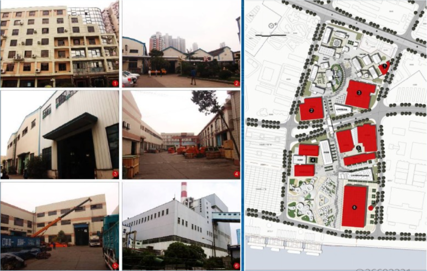 UBPA改造前的建筑及分布位置。最南侧为南市发电厂主厂房,中部半淞园路两侧时一些仓储建筑和中型厂房。如今,它们均被重点改造 图片来源:同济规划院