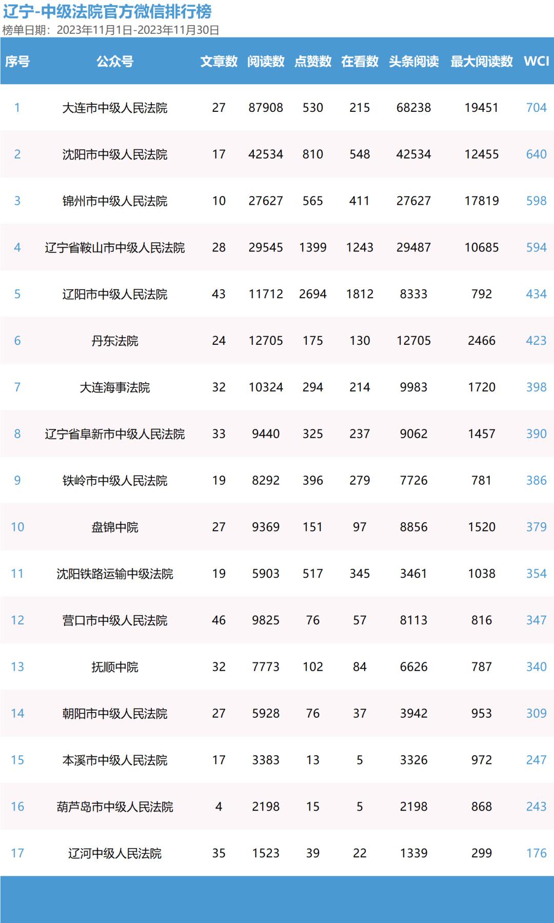 祝贺“锦州市中级人民法院”“普兰店法院”“沈阳市大东区人民法院”“沈阳铁西区法院”“大连经济技术开发区人民法院”“大连高新技术产业园区人民法院”“大连市甘井子区人民法院”排名大幅度提升,其中,“普兰店法院”强势发力,排名前进二十七名,跃居第十位。