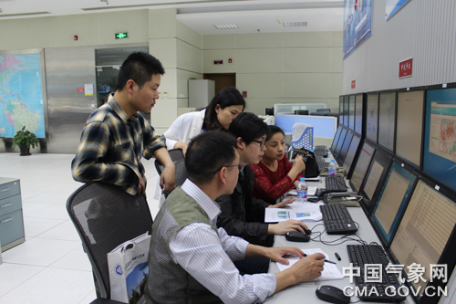 参加交流的省级首席预报员在中央气象台强对流短时预报交流平台研讨预报业务。