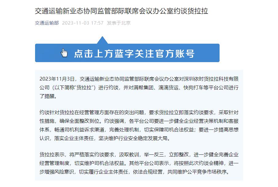 11月3日,交通运输新业态协同监管部际联席会议办公室对深圳依时货拉拉科技有限公司进行约谈,并对满帮集团、滴滴货运、快狗打车等平台公司进行了提醒。