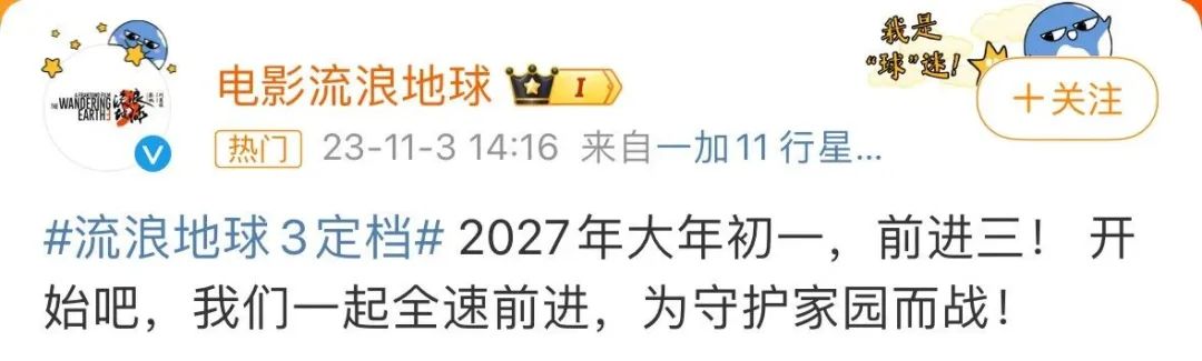 11月3日,电影《流浪地球》官方微博宣布,《流浪地球3》正式定档2027年大年初一。