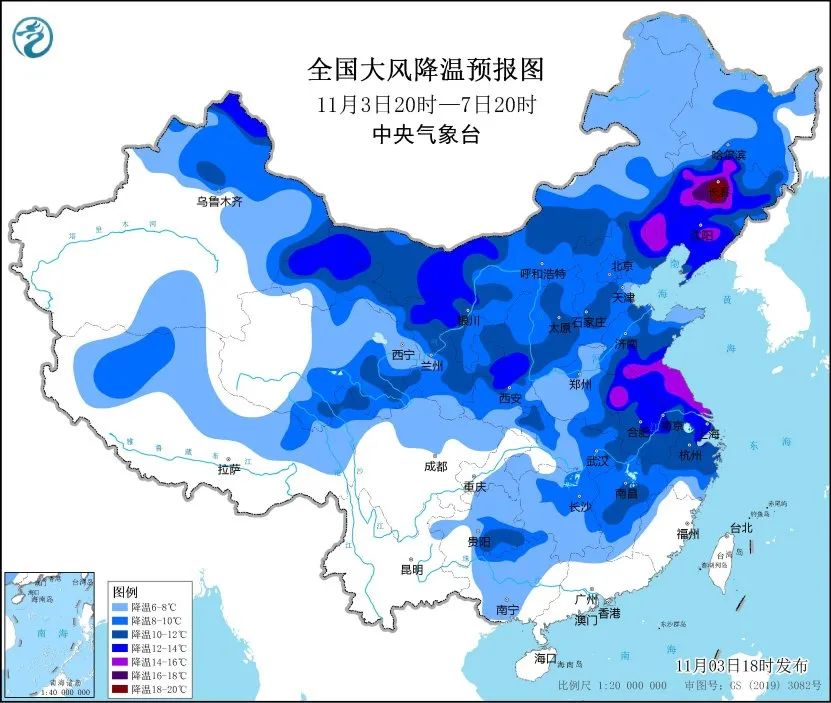 据中央气象台网站消息,中央气象台11月3日18时发布寒潮蓝色预警。受强冷空气影响,11月3日20时至7日20时,我国大部地区自西向东将先后出现大风降温天气,新疆北部、西北地区中东部及我国中东部大部地区气温将下降6~10℃,新疆北部、内蒙古西部、西北地区东部、东北地区中南部、黄淮东部、江淮、江南东北部等地气温下降12~14℃,吉林中部等地局地降温可达16℃以上。