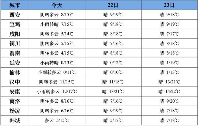 22日:全省多云转晴天。陕北大部、秦岭山区局地有霜冻;