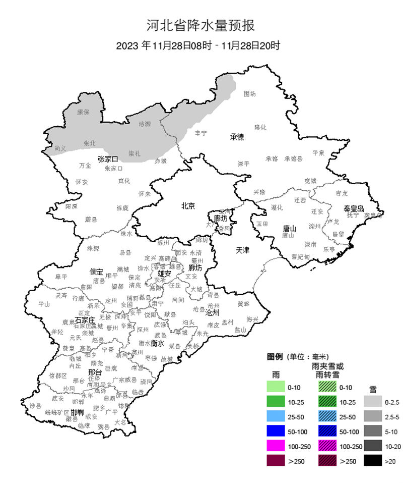 河北省气象台2023年11月27日11时继续发布大风蓝色预警信号:受冷空气影响,预计今天下午到夜间,张家口、承德和保定、石家庄、邢台、邯郸四个地区的西部有西北风4到6级,阵风7到8级;今天夜间,沿岸海域和沿海地区有西北风5到6级,阵风7到8级。请防范!