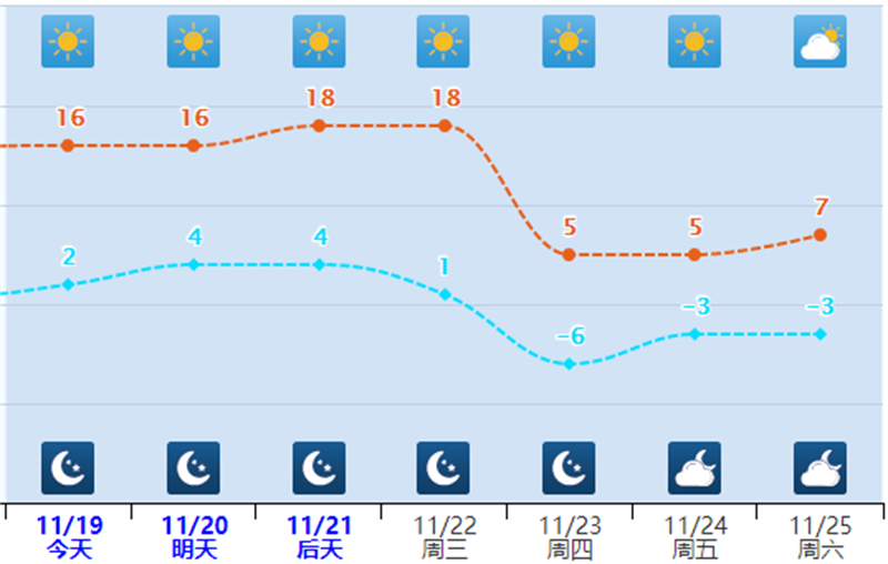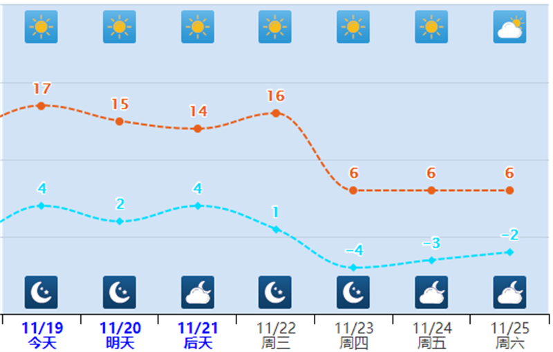 22-24日(下周三至周五),一股实力强劲的冷空气登场,霾应声而散,但是小温暖也将戛然而止,各地遭遇较强降温,23-24日,全省大部分地区最低气温下降8~12℃,北部局地可达14~16℃。24日前后,大部地区最低气温将降至入冬以来新低!