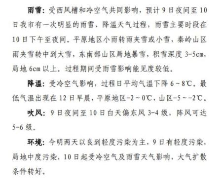 受西风槽和冷空气共同影响,预计9日夜间至11日我省有一次明显的雨雪、降温天气过程,雨雪主要时段在10日白天至夜间。预计陕北、秦岭山区、商洛有中到大雪,局地暴雪,积雪深度3-5cm,局地6cm以上;关中北部雨或雨夹雪转小雪,关中南部小到中雨转雨夹雪,汉中、安康有小到中雨,局地大雨,南部山区雨转雨夹雪。