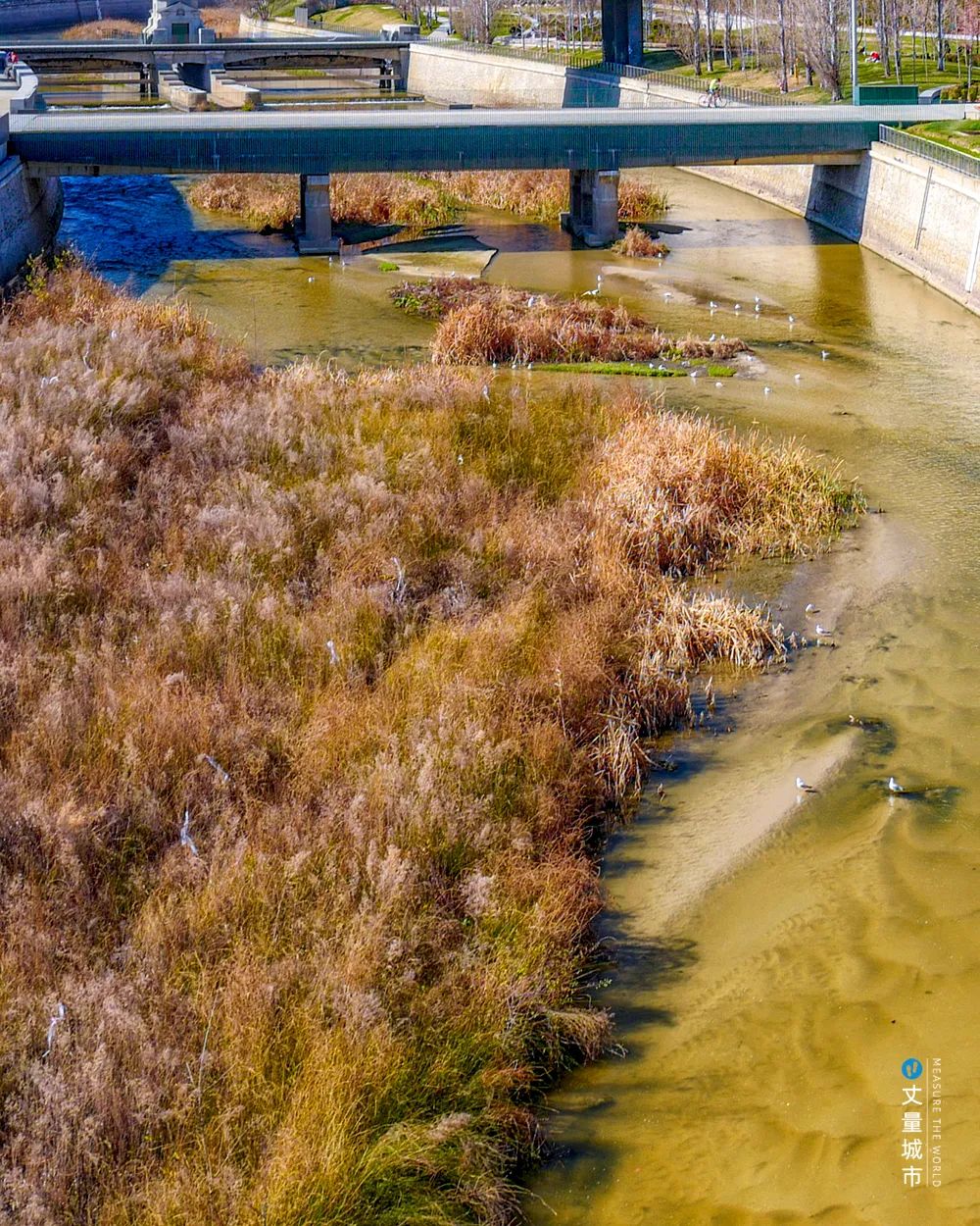 ▼ 马德里河岸公园局部野化的河道成为鸟类的栖息地
