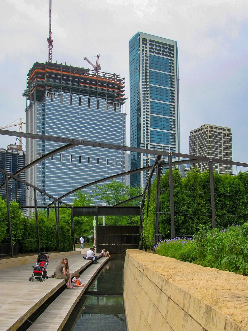 花园整体设计分为两个板块,展现了芝加哥的历史发展景观,一部分是遮荫为主,茂密且潮湿的环境,一部分是充满阳光的、干燥的草原化形态。中间穿插的水景用木板路分开,代表了芝加哥过去与现在之间的交汇,在一年四季中展现与众不同的自然魅力。