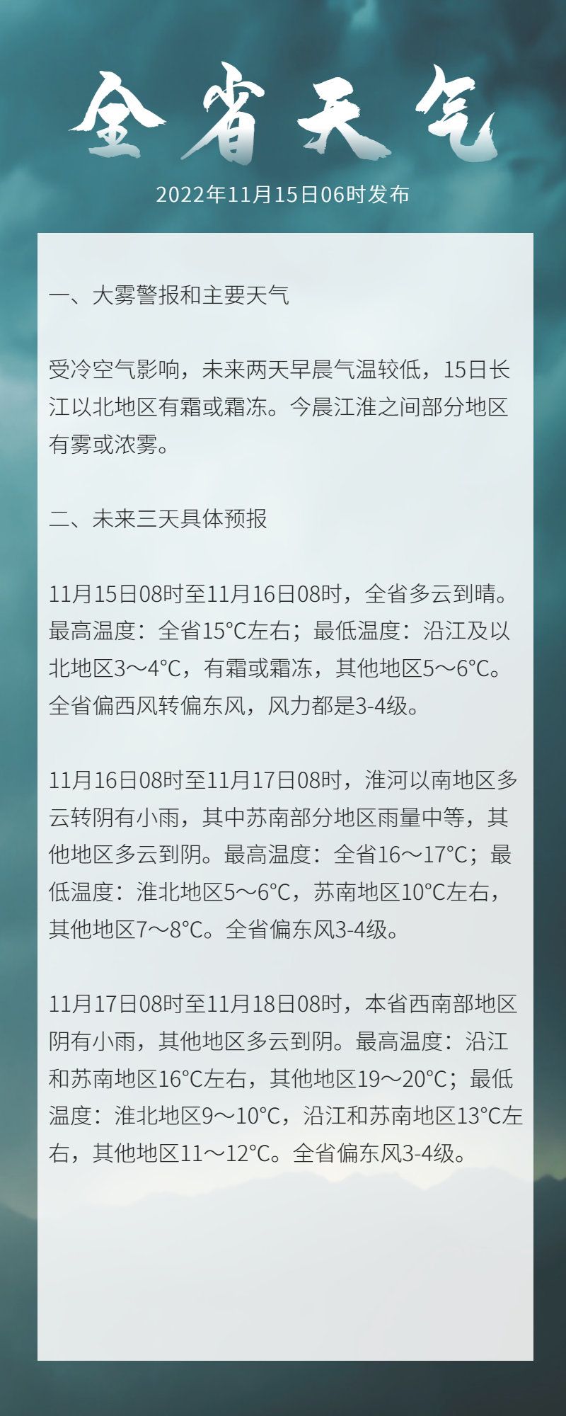 【受冷空气影响,未来两天早晨气温较低,15日长江以北地区有霜或霜冻。今晨江淮之间部分地区有雾或浓雾】11月15日08时至11月16日08时,全省多云到晴。最高温度:全省15℃左右;最低温度:沿江及以北地区3~4℃,有霜或霜冻,其他地区5~6℃。全省偏西风转偏东风,风力都是3-4级。